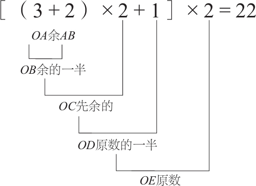 例二: 某人有桃若干个,拿出一半多1个给甲,又拿出剩余的一半多2个给乙,还剩3个,求原有桃数。