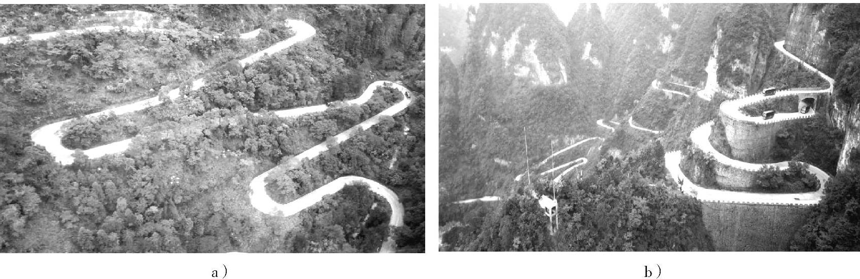通车园路是以交通功能为主的园路,可以采用公路形式,如大型公园中的环湖公路、山地公园中的盘山公路和风景名胜区中的主干道等。园林公路的景观组成比较简单,其设计要求和工程造价都比较低,如图1-10所示。