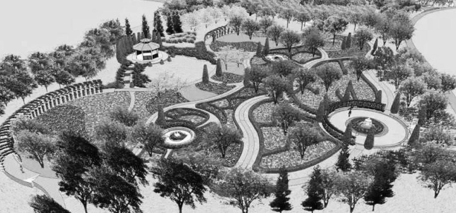 不同色彩、不同纹理图样和不同材质的路面处理能够把路面本身装饰得十分美观。在园路、广场的侧旁或中轴线上可以布置一些花境、花坛、水池、喷泉、雕塑甚至园亭等造景要素,使园路、广场的景观更加美丽动人,如图1-8所示。