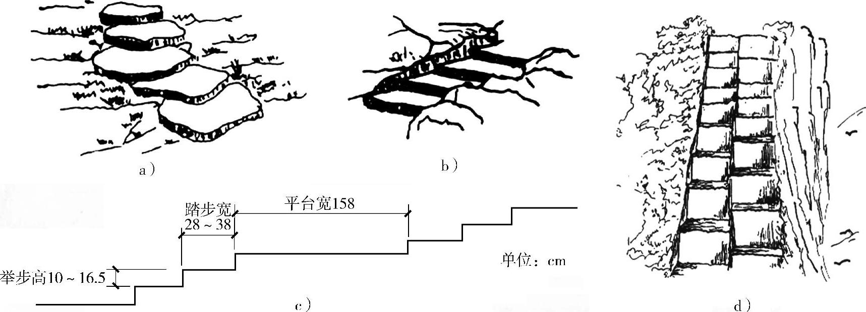 a)自然石板的台阶 b)裸岩凿成的台阶 c)室外台阶及适宜尺寸 d)磴道