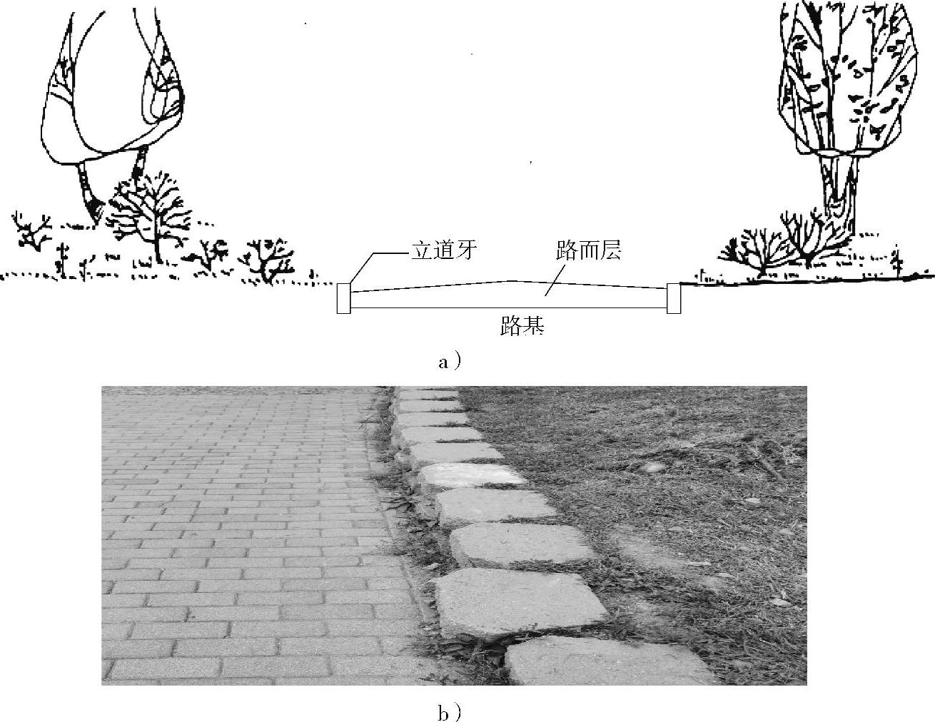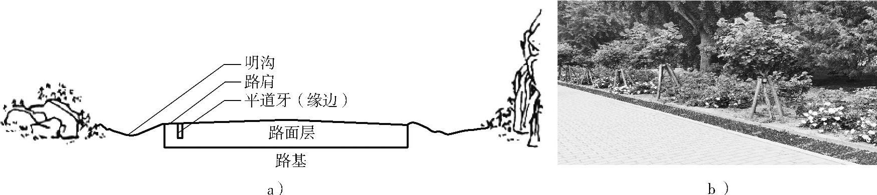 凡是园路的路面低于周围绿地,立道牙高于路面,起到阻挡绿地水土流失作用的园路都属于路堑型园路,如图1-15所示。
