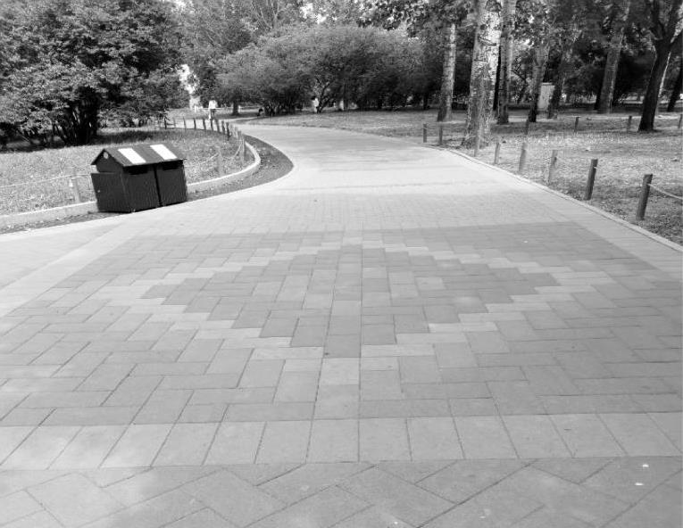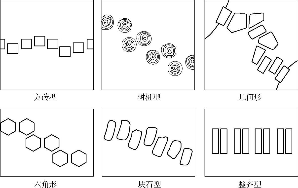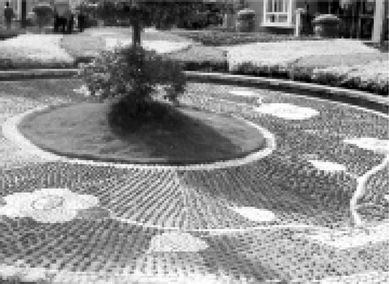 块料路面是用大方砖、石板等各种天然块石或各种预制板铺装而成的路面,如木纹板路面、拉条水泥板路面、假卵石路面等。这种路面简朴、大方,特别是各种拉条路面,利用条纹方向变化产生的光影,加强了花纹的效果,不但有很高的装饰性,而且可以防滑和减少反光强度,并能铺装成形态各异的图案花纹,美观、舒适,同时也便于进行地下施工时拆补,因此在现代绿地中被广泛应用,如图1-20所示。
