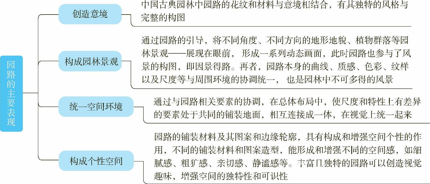 园路作为园林景观的界面之一,自始至终伴随着游人,影响着景观的效果,它与山石、水体、植物、建筑等造园要素,共同构成优美丰富的园林景观,园路的主要表现如图1-2所示。