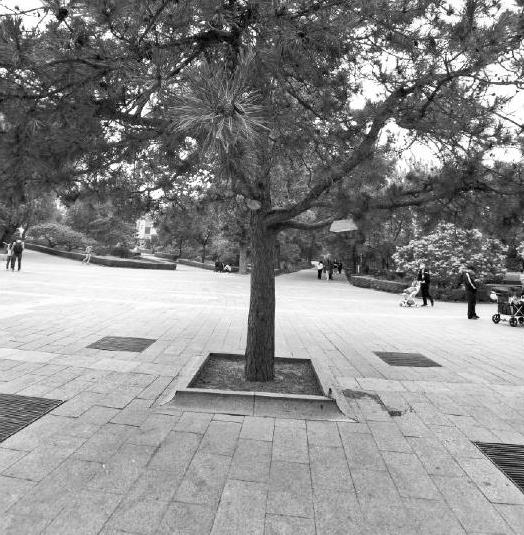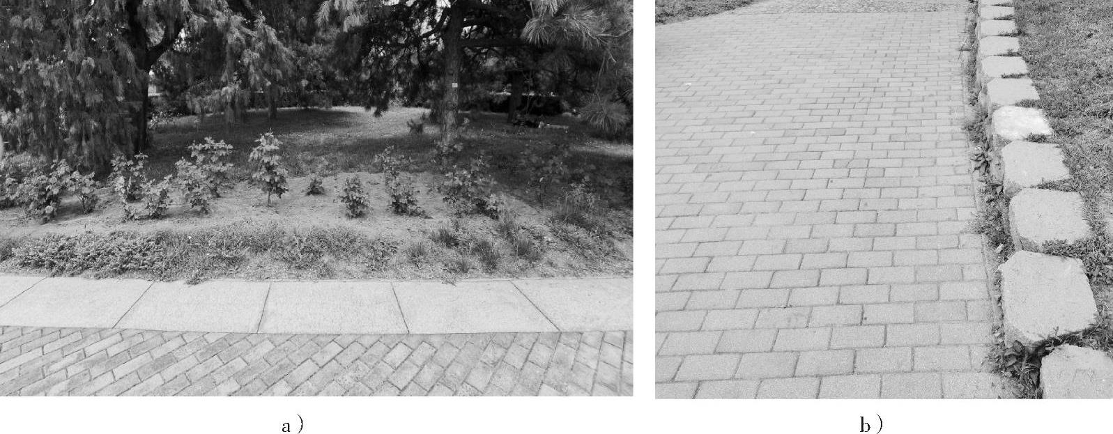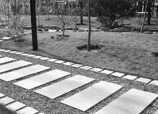 非透水性路面指吸水率低,主要靠地表排水的路面。不透水的现浇混凝土路面、沥青路面、高分子材料路面以及各种在不透水基层上用砂浆铺贴砖、石、混凝土预制块等材料铺成的园路都属于此类。这种路面平整度和耐压性较好,整体铺装的可用作机动交通、人流量大的主要园路,块材铺筑的则多用于次要园路、游步道、广场等,如图1-24所示。