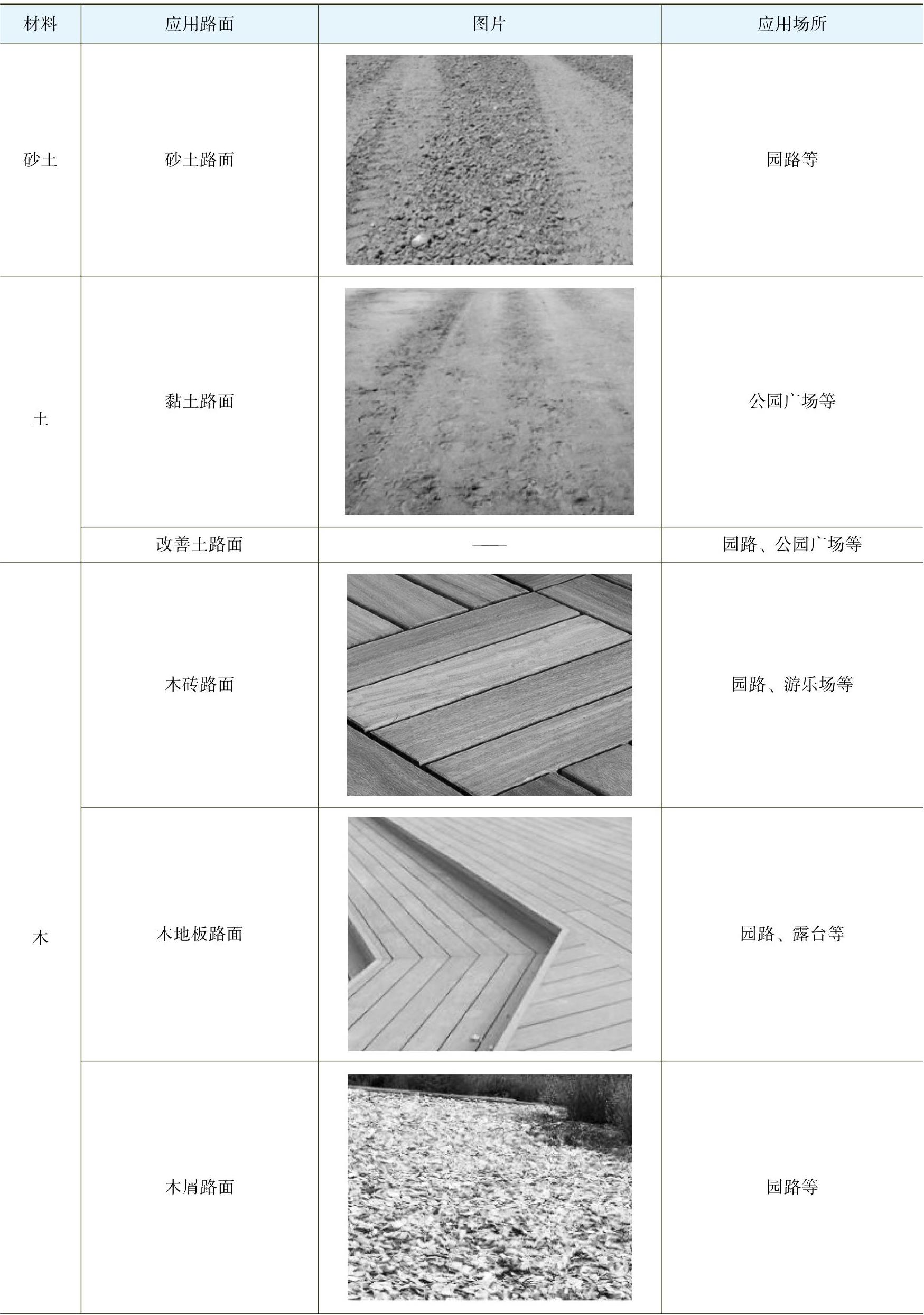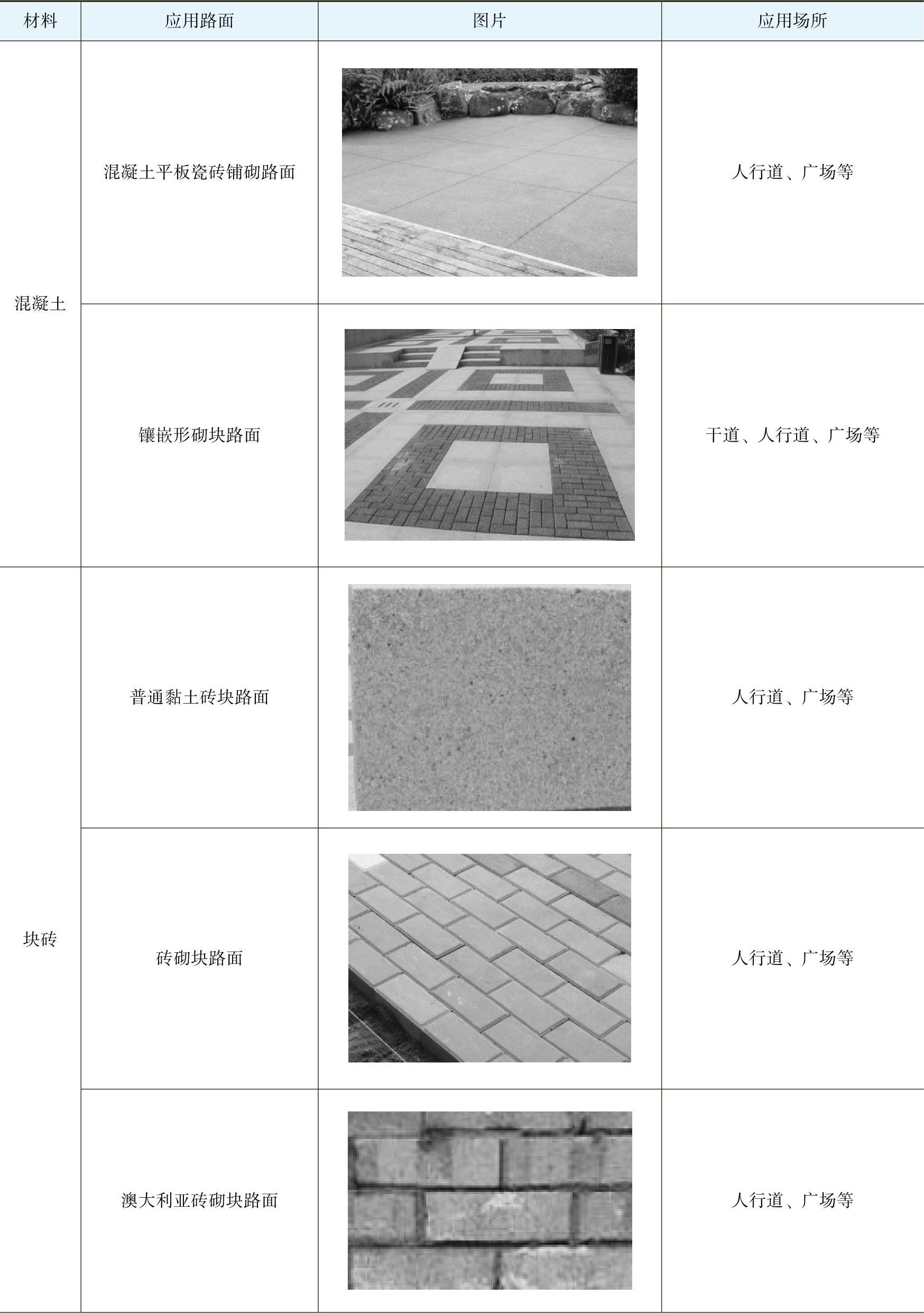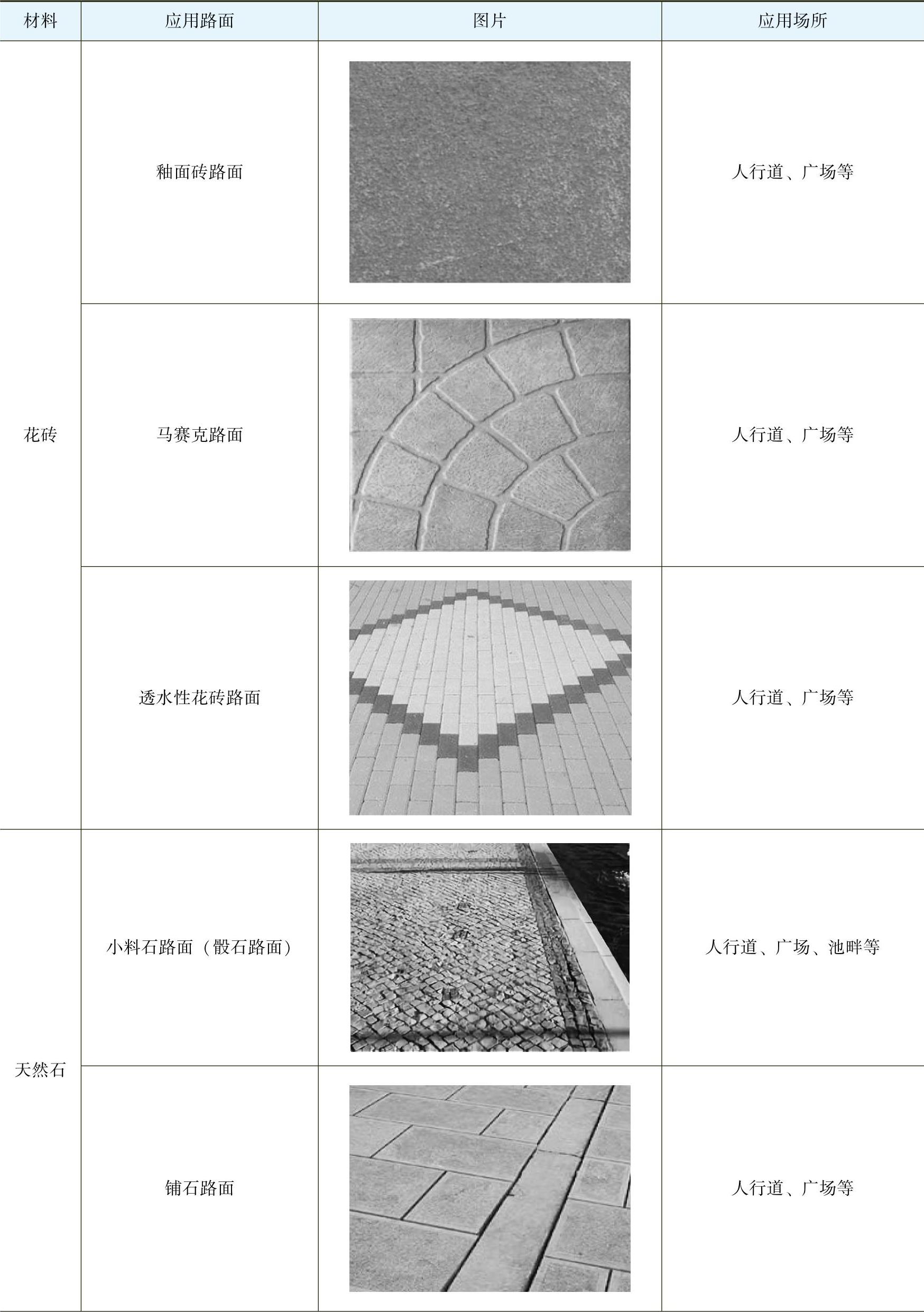常见园路的材料分类及应用,见表1-1。