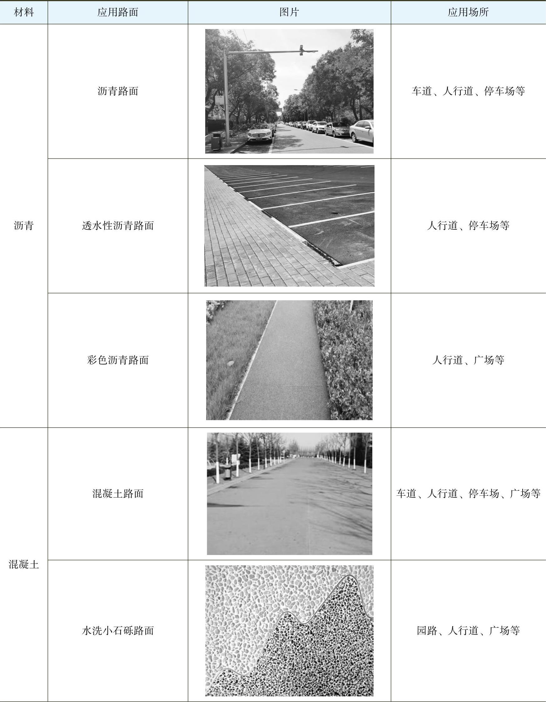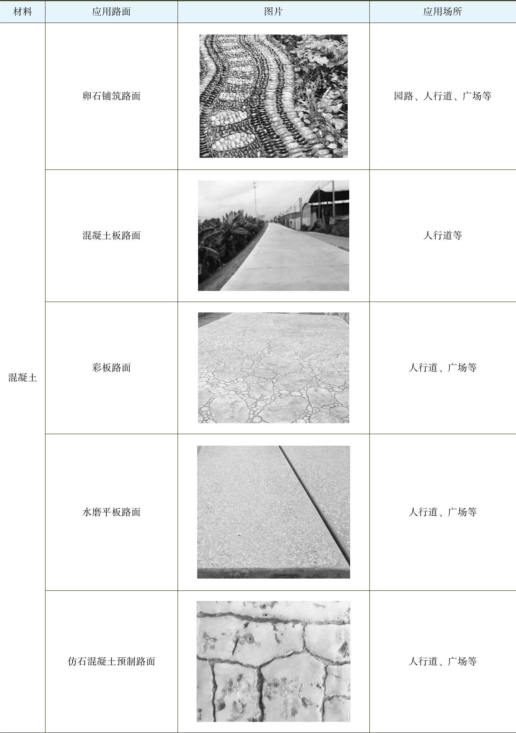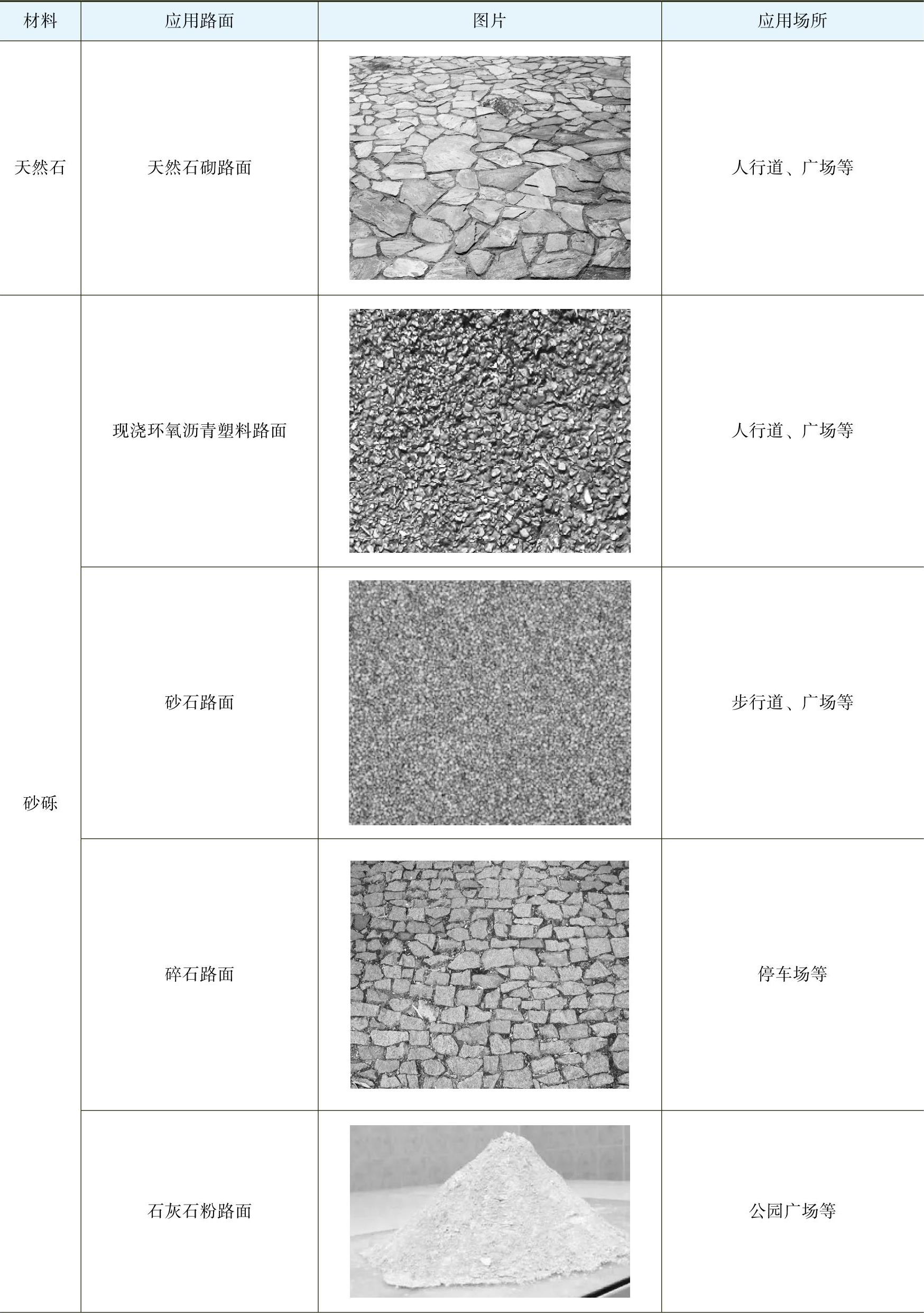 常见园路的材料分类及应用,见表1-1。
