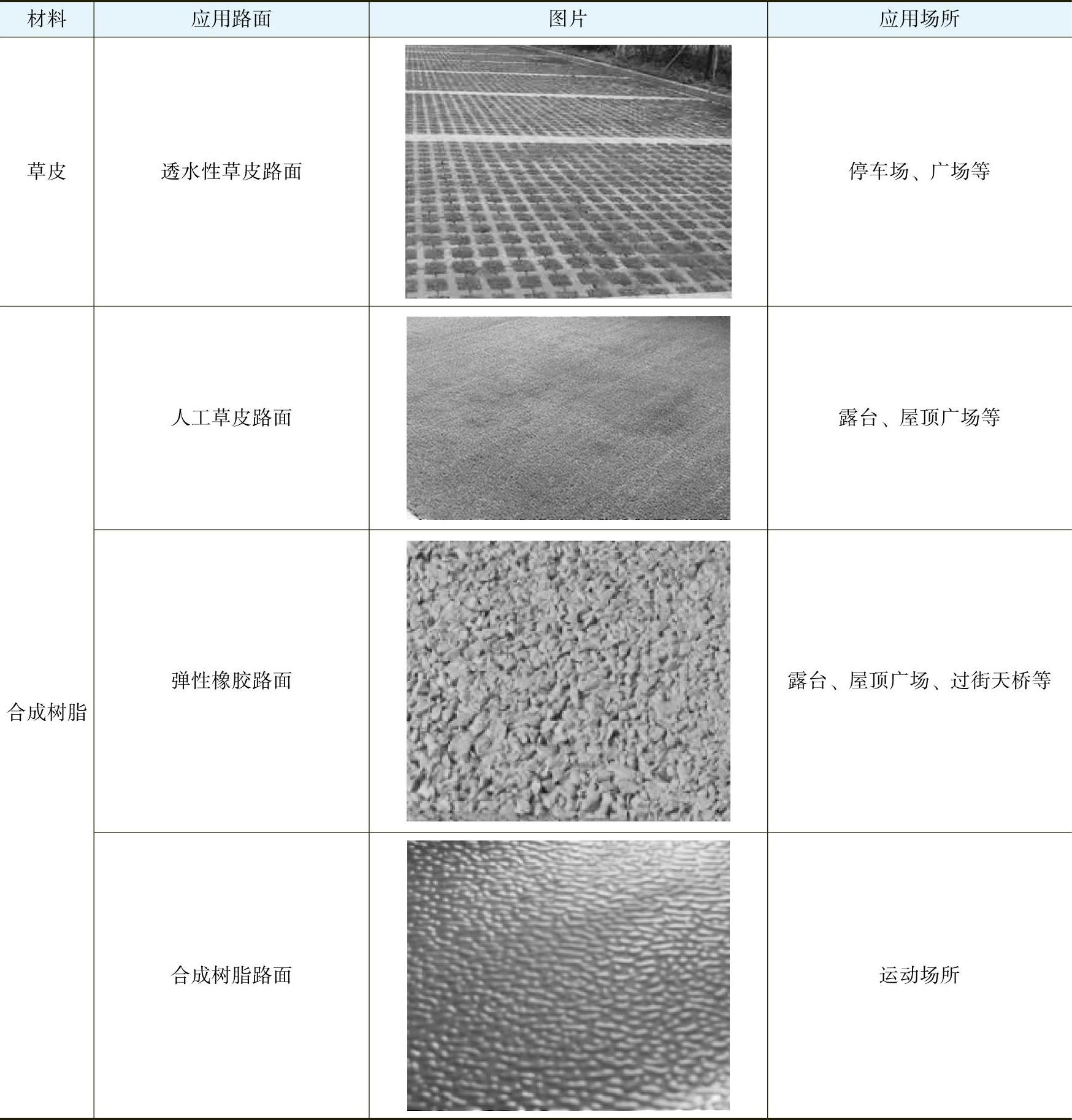 透水性路面指下雨时,雨水能及时通过路面结构渗入地下,或者储存在路面材料的空隙中,减少地面积水的路面。其做法既有直接采用吸水性好的面层材料,也有将透水的材料干铺在透水性基层上,所用材料包括透水混凝土、透水沥青、透水性高分子材料以及各种粉粒材料路面、透水草皮路面和人工草皮路面等。这种路面可减轻排水系统的负担,保护地下水资源,有利于生态环境,但平整度、耐压性往往不足,养护量较大,主要用于游步道、停车场、广场等处,如图1-23所示。