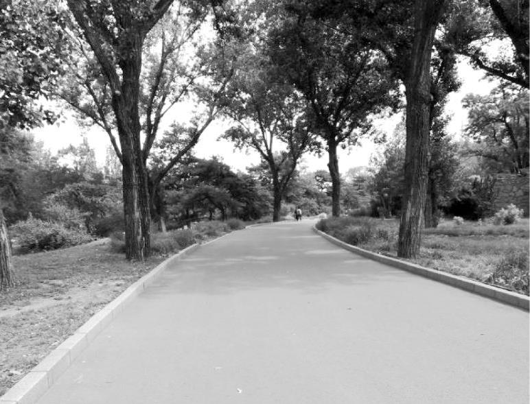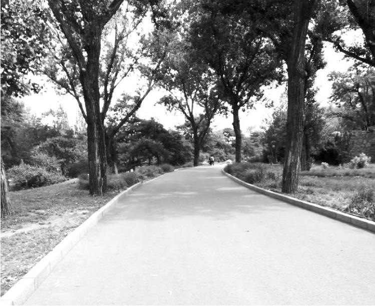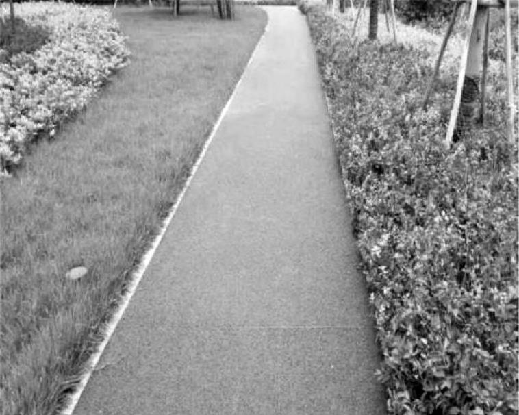 整体路面是在园林建设中应用最多的一类,是用水泥混凝土或沥青混凝土铺筑而成的路面。它具有强度高、耐压、耐磨、平整度好的特点,但不便维修,且一般观赏性较差。由于养护简单、便于清扫,因此多为大公园的主干道所采用。但它色彩多为灰色和黑色,在园林中使用不够理想,近年来已出现了彩色沥青路面和彩色水泥路面,如图1-19所示。