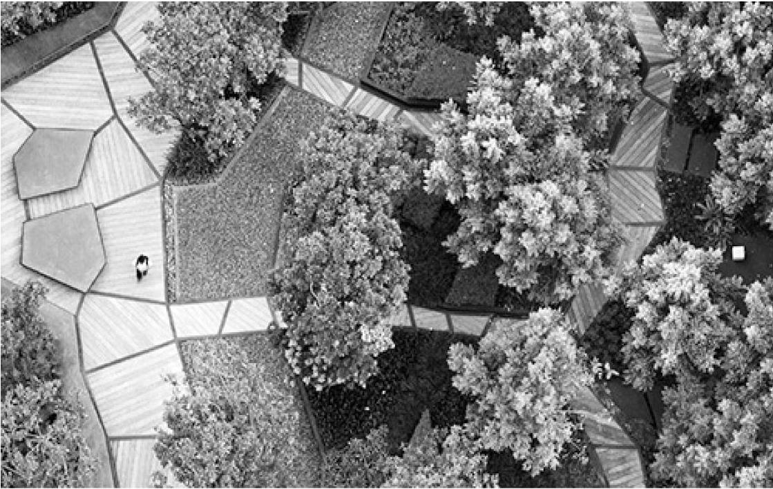 园路的穿插划分把园林其他空间划成了大小、形状不一的系列空间,使得园林中既有闭合空间,又有开敞空间;既有规则的矩形、圆形空间,又有自然的异形空间。这极大地丰富了园林空间的形象,增强了空间的艺术性表现,如图1-5所示。