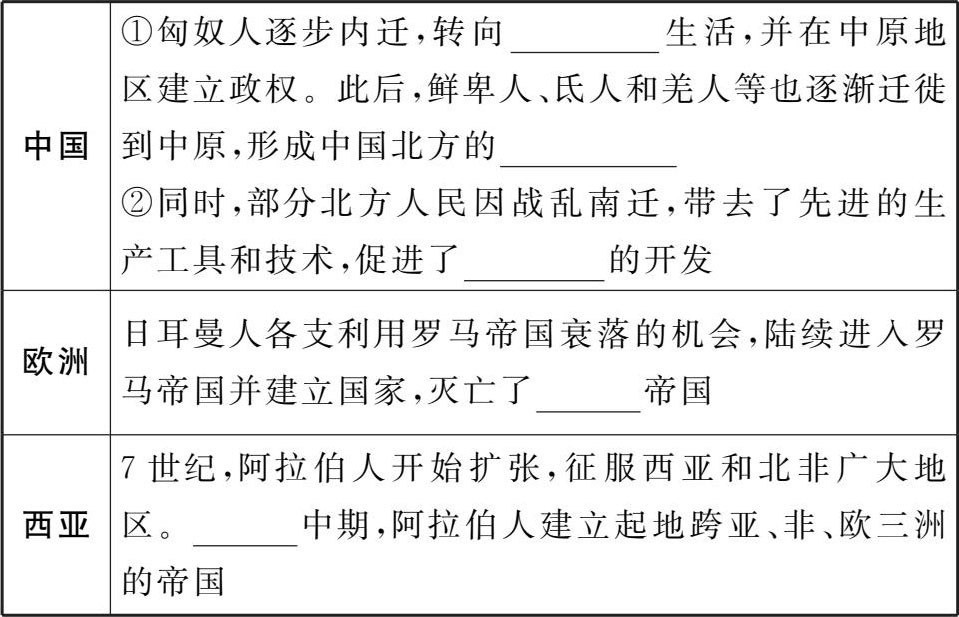 (1)政治格局:亚欧游牧民族大迁徙,改变了亚欧大陆从东到西的_____,一批新的国家先后崛起。