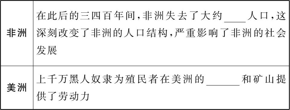 (2)美洲:弥补了美洲劳动力不足的状况,为殖民者在美洲的种植园和矿山提供了劳动力。美洲的黑人数量大量增加,成为美洲重要的族群。