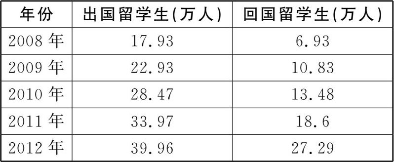下面为“2008—2012年中国出国和回国留学生统计表”,从下表可以获得的信息是( )