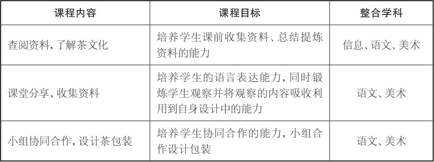 本美术综合课程以茶文化为载体,结合美术、语文、信息、历史学科,培养学生的综合学习能力。学生犹如一名设计师,需要掌握设计的基本流程,确定设计目标,进行内容构思,表现设计理念,构建视觉元素,最终制作完成作品。课程内容由单一维度扩展到多维度,使学生学习任务的难度直线上升。