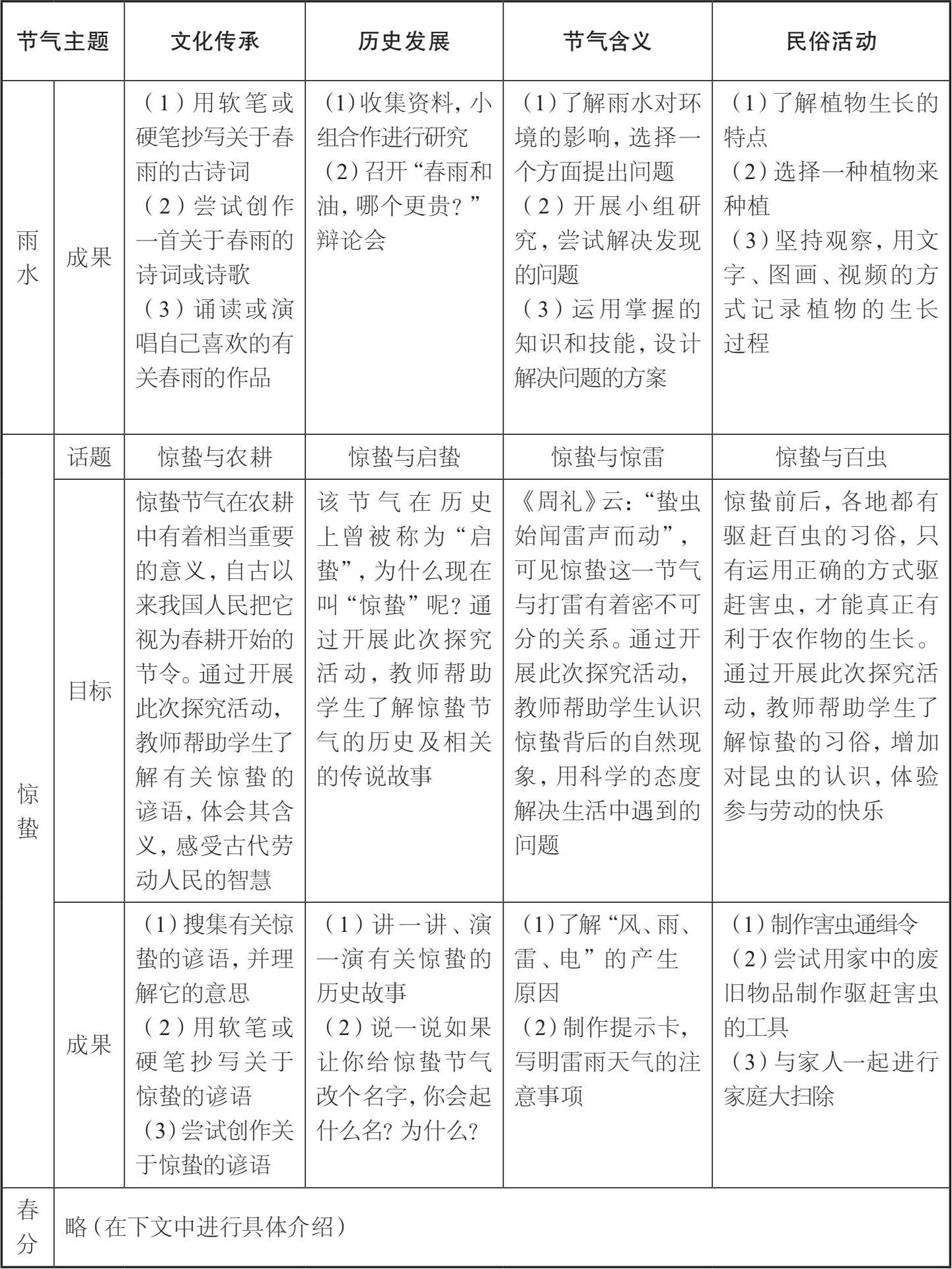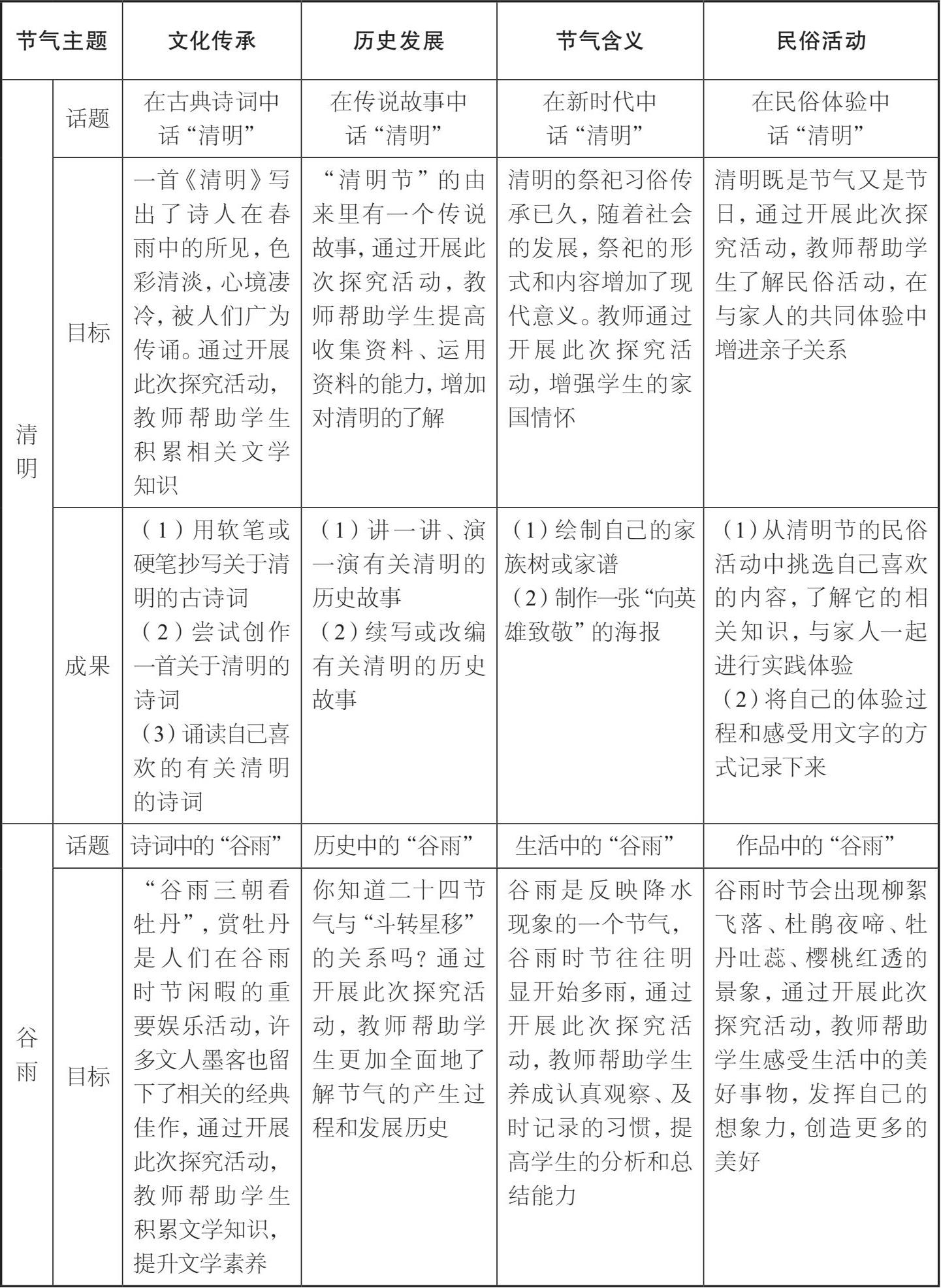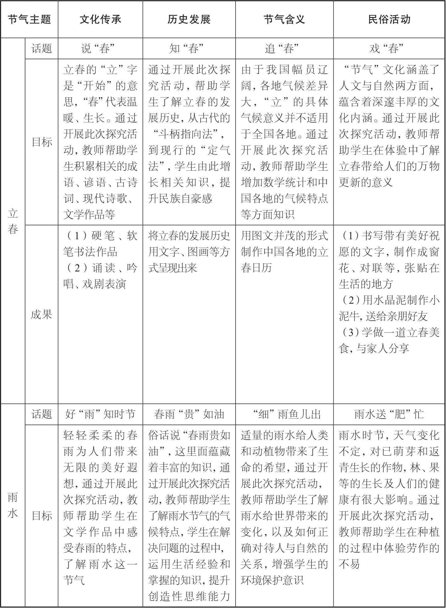 这一课程的实施时间为2020年2—4月,是在学生居家学习期间开展的综合性学习,内容只包括部分节气。我们围绕“文化传承”“历史发展”“节气含义”“民俗活动”四大主题,结合“立春”“雨水”“惊蛰”“春分”“清明”“谷雨”六个节气开展了综合性学习课程。