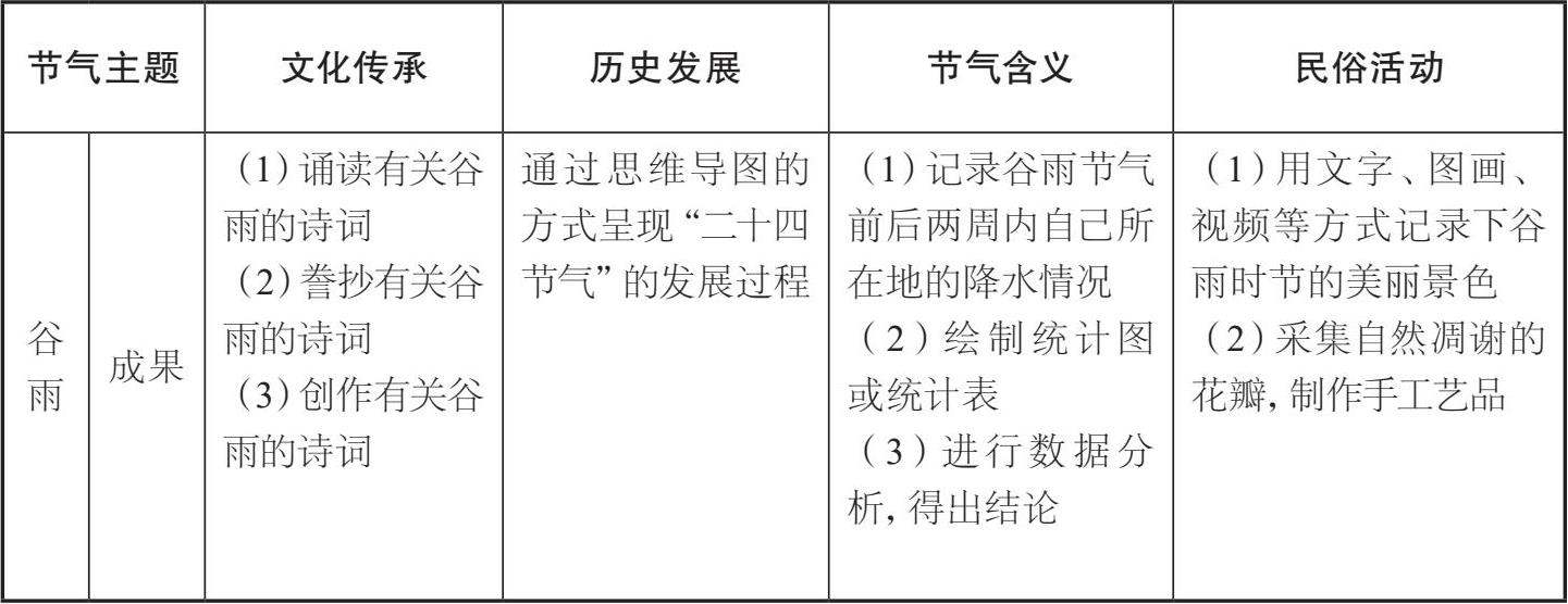 (1)帮助学生在实践与探究过程中了解与“二十四节气”相关的传统文化知识,如谚语、古诗词、其他文学作品等,增长知识,提升素养;学生通过自己的体验与创新,传承传统文化。