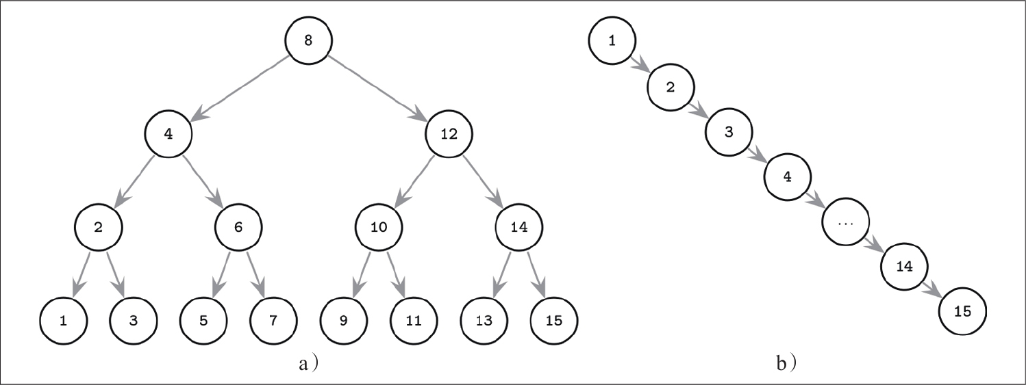 插入操作并不会遵循任何特定模式,元素插入可能导致树不平衡的情况(即它的一个分支比另一个分支长)。最差的情况如图2-3b所示,我们最终得到一棵病态树(pathological tree),它看起来更像一个链表,此时我们得到的不是期望的对数时间复杂度(图2-3a),而是线性时间复杂度。