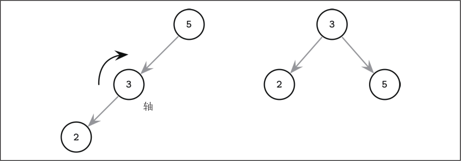 保持树的平衡的方法之一是在添加或删除节点后执行旋转:如果插入操作使分支不平衡(分支中的两个连续节点只有一个子节点),则可以围绕中间节点旋转树。在图2-4所示的示例中,旋转后中间节点(3)(称为旋转轴)被提升了一层,这样一来其父节点就成为其右子节点。