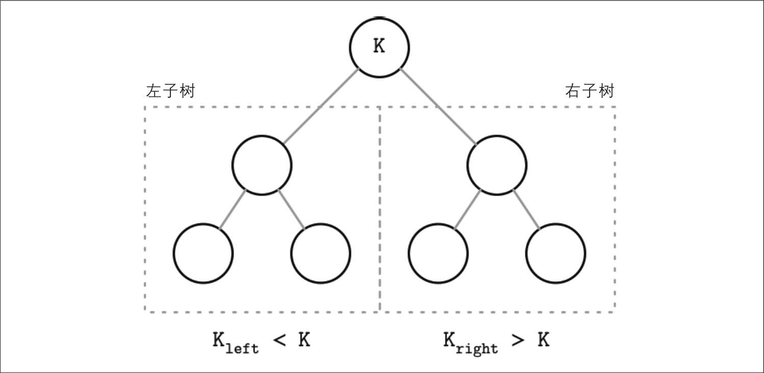 每个节点将搜索空间分为左子树和右子树,如图2-2所示:一个节点的键大于其左子树中存储的任何键,且小于其右子树中存储的任何键[SEDGEWICK11]。