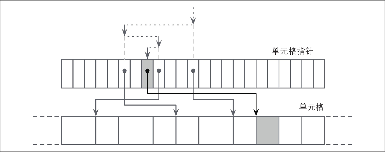 图4-7:带间接指针的二分搜索(要搜索的元素显示为灰色。虚线箭头表示通过单元格指针进行二分搜索。实线表示跟随单元格指针所进行的访问动作,这是比较单元格的值与搜索键所必需的动作)
