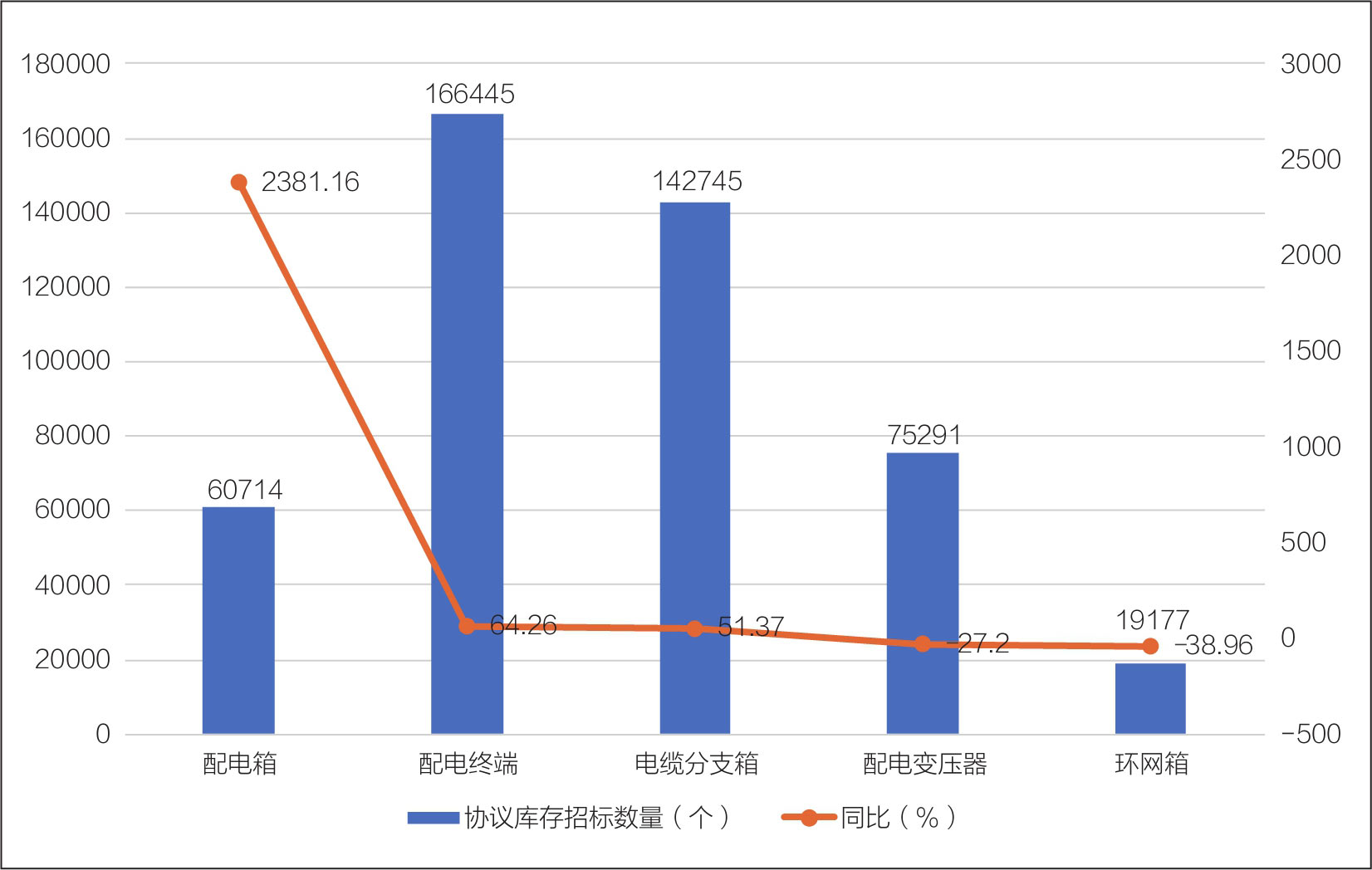 根据2019年国家电网公司配电网设备协议库存招标情况,配电箱招标60714个,同比增长2381.16%,其中户外配电箱招标57173个,占比94.17%;共招标配电终端166445套,同比增加64.26%,其中配变终端招标138505套,占比83.21%,馈线终端招标16068套,占比9.65%,站所终端招标11872套,占比7.13%;共招标电缆分支箱142745只,同比增加51.37%,其中电缆分支箱以400V为主,共招标133642只,占比93.62%;共招标配电变压器75291台,同比减少27.20%,其中配电变压器以10kV为主,共招标75249台,占比99.94%,油浸式变压器招标73137台,占比97.14%;共招标环网箱19177台/套,同比减少38.96%,其中环网箱以10kV为主,共招标19173台/套,占比99.98%,一二次融合成套环网箱招标12694台/套,占比66.19%,SF 6 绝缘环网箱招标11080台/套,占比87.29%。2019年国家电网公司部分配电网设备协议库存招标数及同比数据如图1-1所示。