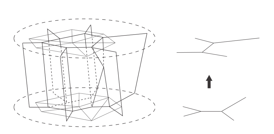 如果让一个自旋网络演化,我们就会得到一个离散的时空结构。这个离散时空的事件是图10-6中所示形式发生变化的过程。实际上我们可以画出演化的自旋网络图,它们看起来就像图10-7到10-9。一个演化的自旋网络很像一个时空,但它是离散的而不是连续的。