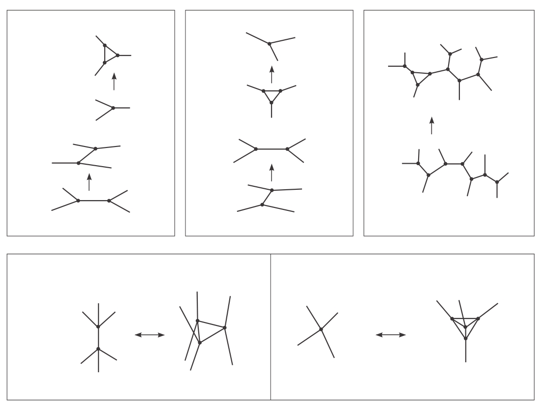 在经典的广义相对论中,空间的几何形状随时间而演化。例如,当引力波经过一个表面时,这个表面的面积会随时间而振荡。实际上这里也有一种等效的量子图,其中自旋网络的结构可能随着引力波的通过而随时间演化。图10-6显示了自旋网络随时间演化的一些简单步骤。