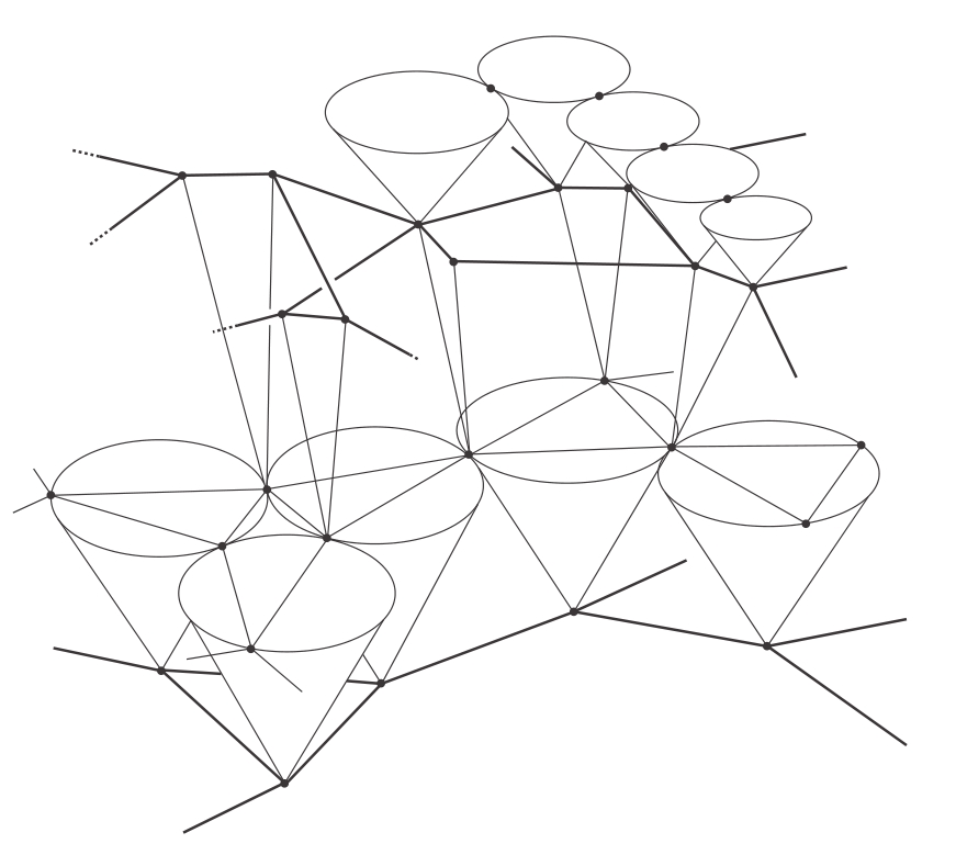 另一张量子时空的图片,展示了自旋网络改变的事件的因果未来,用第4章介绍的光锥绘制。