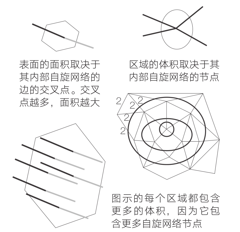 圈量子引力理论预测的空间的量子化。自旋网络的边缘携带着离散的面积单位。表面的面积来自其自旋网络的边的交叉点。最小的面积来自一个交叉点,大约是10 -66 平方厘米。自旋网络的节点携带离散的体积单位。最小的体积来自一个节点,大约是10 -99 立方厘米。