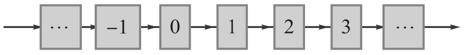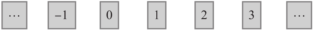 到目前为止,我们给出的例子的状态空间都只有有限多个状态。我们有理由提出一个具有无穷多个状态的动力学系统。例如,想象在一条直线上有无穷多个离散点——就像一个在往返方向上有无穷多个车站的铁道。假设某种记号笔可以根据某种规则从一个点跳到另一个点。为了描述这个系统,我们可以像之前给离散的时间步标记一样,用整数给直线上这些点标记。因为我们已经用了符号 n 表示离散的时间步,这里我们用大写的 N 代表直线上的点。标志物的历史由函数 N ( n )构成,告诉你在每个时间步 n 它所处直线 N 上的位置。图1-11展示了这个状态空间的一部分。