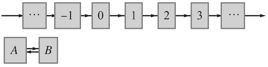在公式(1)中,无论你从哪里出发,最终都会向前或向后到达另一个点。我们称它为单无限循环。然而对于公式(3),如果你从 N 的奇数值出发,那么你永远不会到达偶数值,反之亦然。因此我们称它为双无限循环。