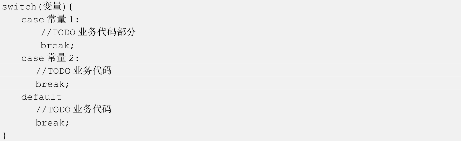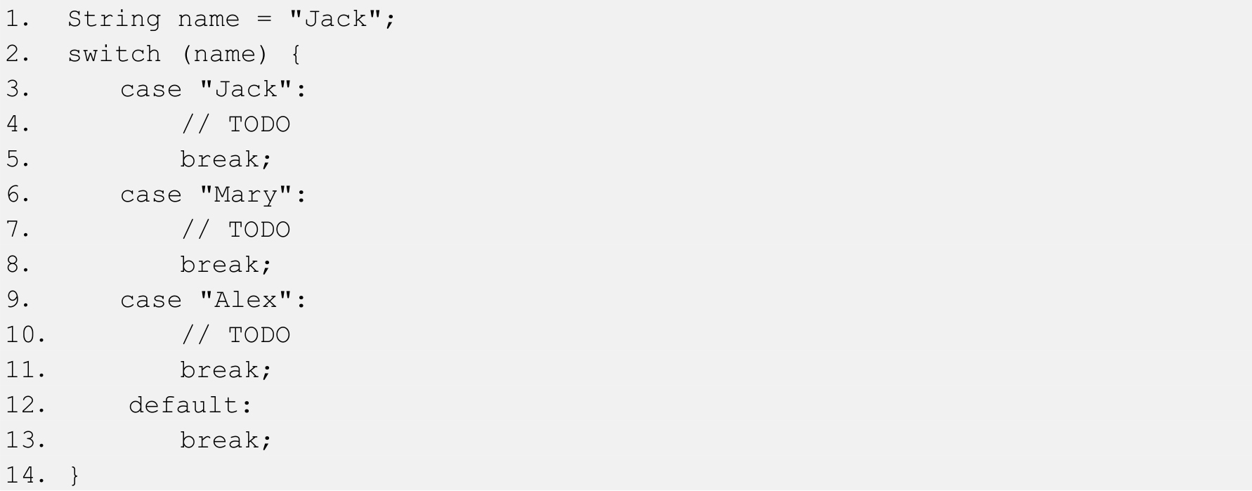 变量的可选值为String(JDK 1.7以后)、int及int兼容类型或是枚举。case可以有多个,case后面的值必须是常量。每一个case后面都应该用break来停止这个分支,否则将会继续向后执行,直至遇到break为止。