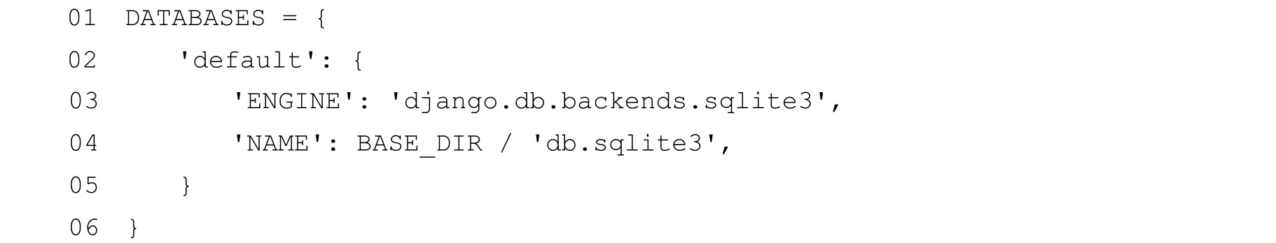 ● 第03行代码中,ENGINE字段配置的就是SQLite数据库驱动('django.db.backends.sqlite3')。