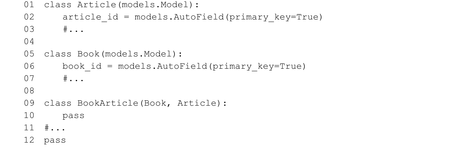 ● 第09~10行代码中,定义了一个子类(BookArticle),用于描述书籍和文章的模型,同时继承自Article模型和Book模型。