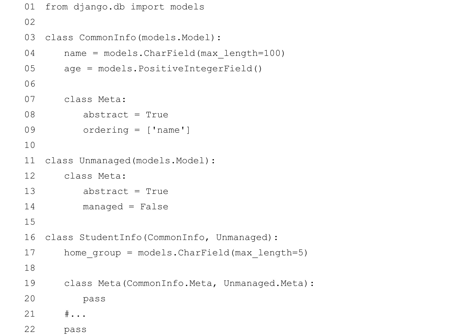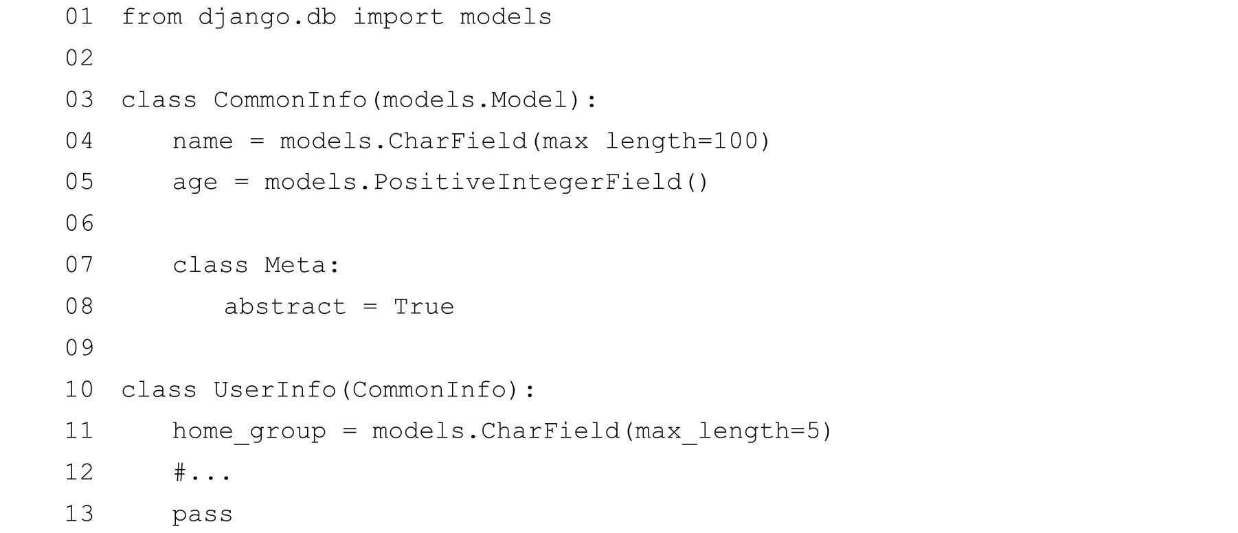 ● 第07~08行代码中,在Meta类中添加了属性abstract=True,表明该类(CommonInfo)为抽象基类。