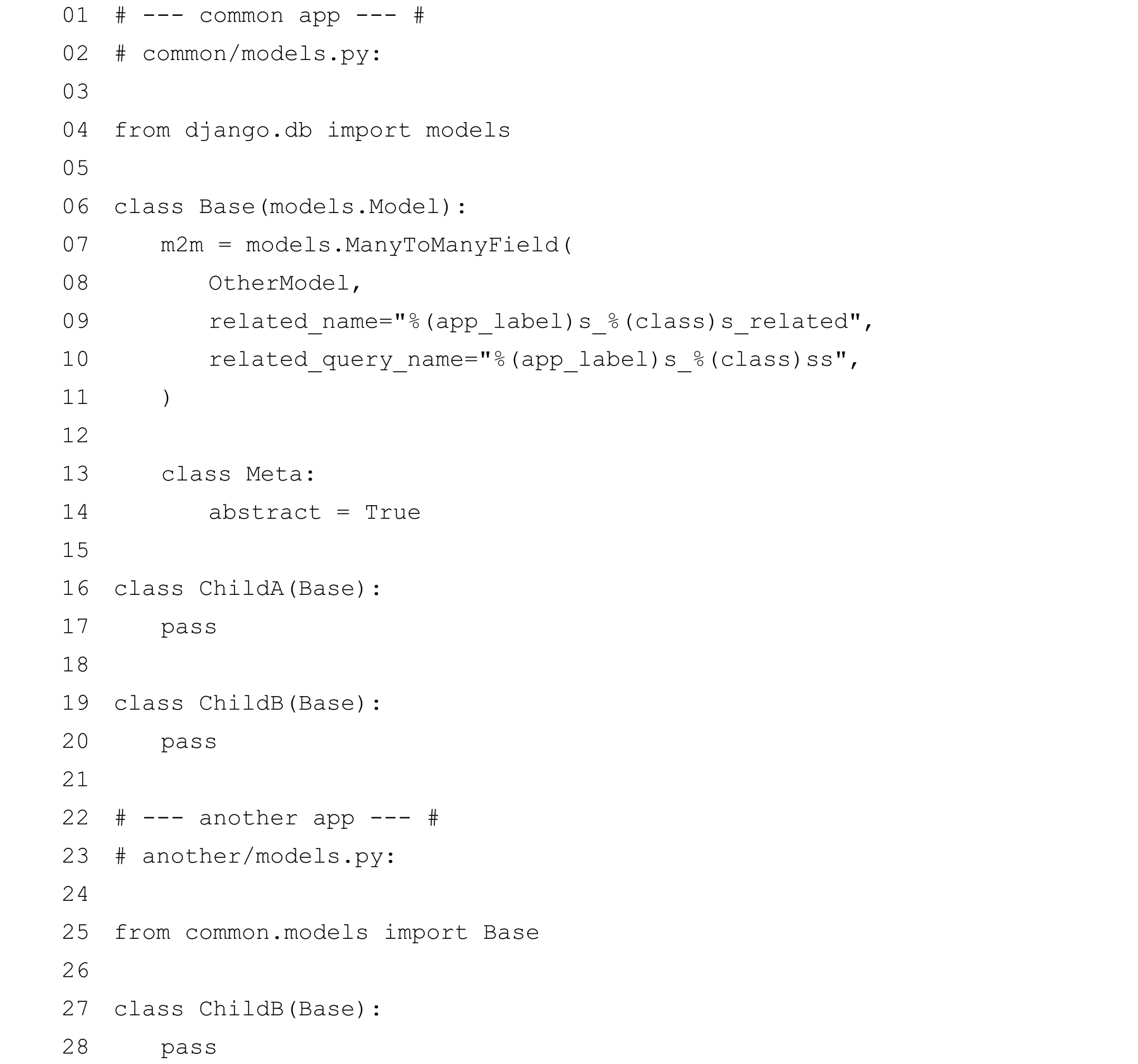 为了解决上述问题,当在抽象基类中(也只能是在抽象基类中)使用related_name属性和related_query_name属性时,部分值需要包含“%(app_label)s”和“%(class)s”,具体说明如下: