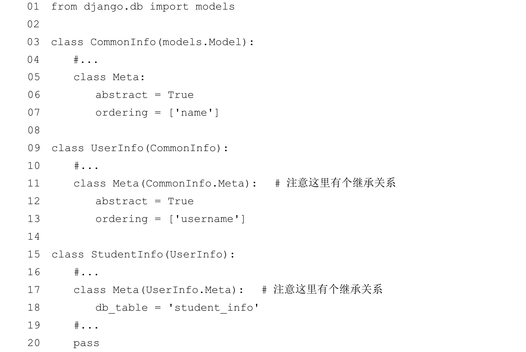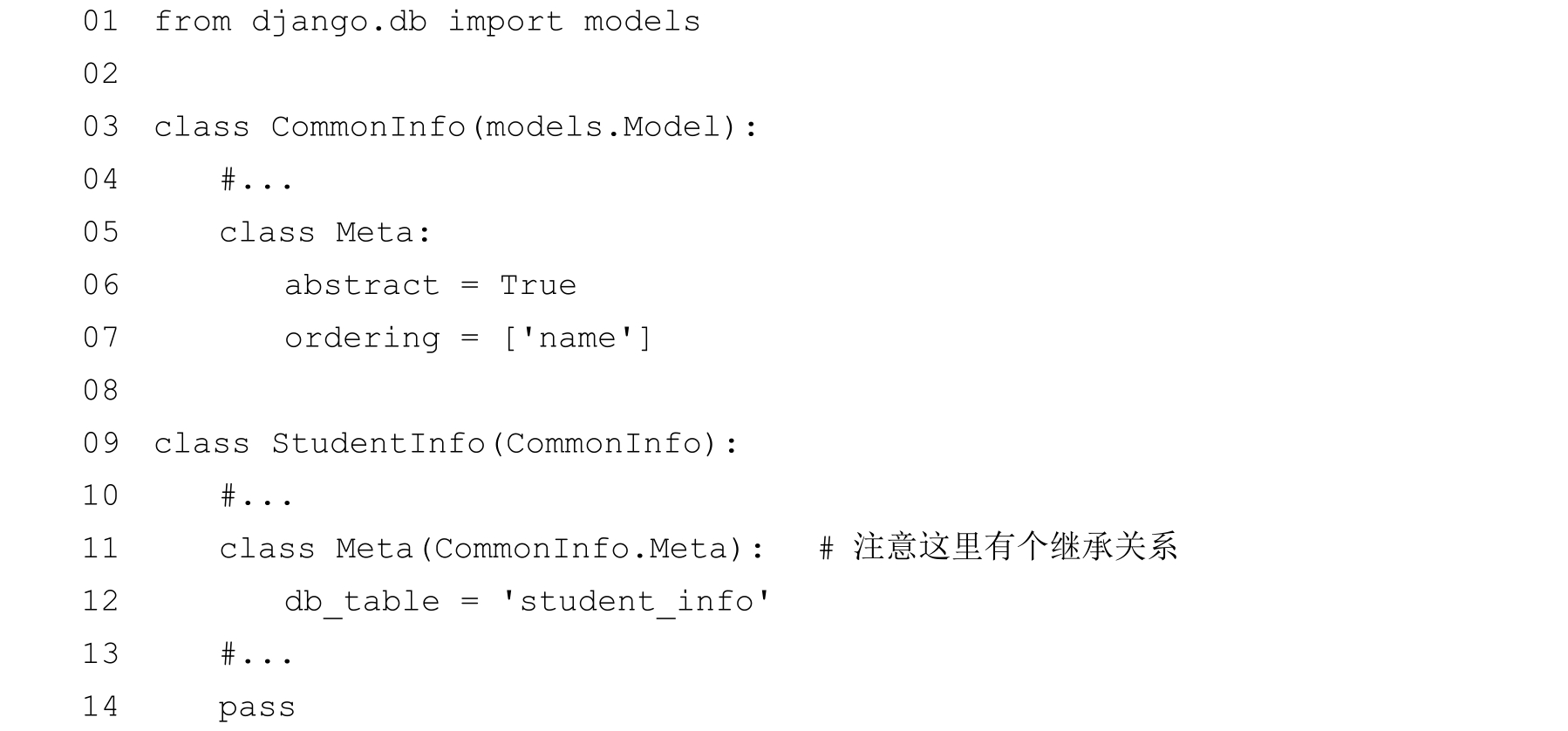 ● 第11行代码中,定义了自己的Meta类子类,并继承自基类的Meta类(CommonInfo.Meta)。