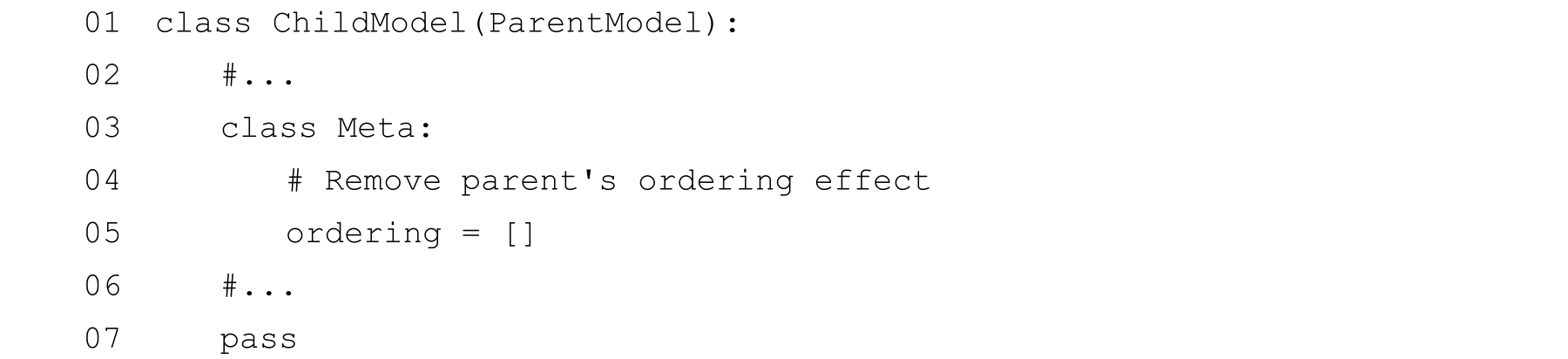 不过也有例外情况,若子类未指定ordering属性或get_latest_by属性,则子类会从父类继承这些属性。而如果父类有排序属性,在设计子类时并不期望有排序属性,则可以显式进行禁止。请看下面的代码示例: