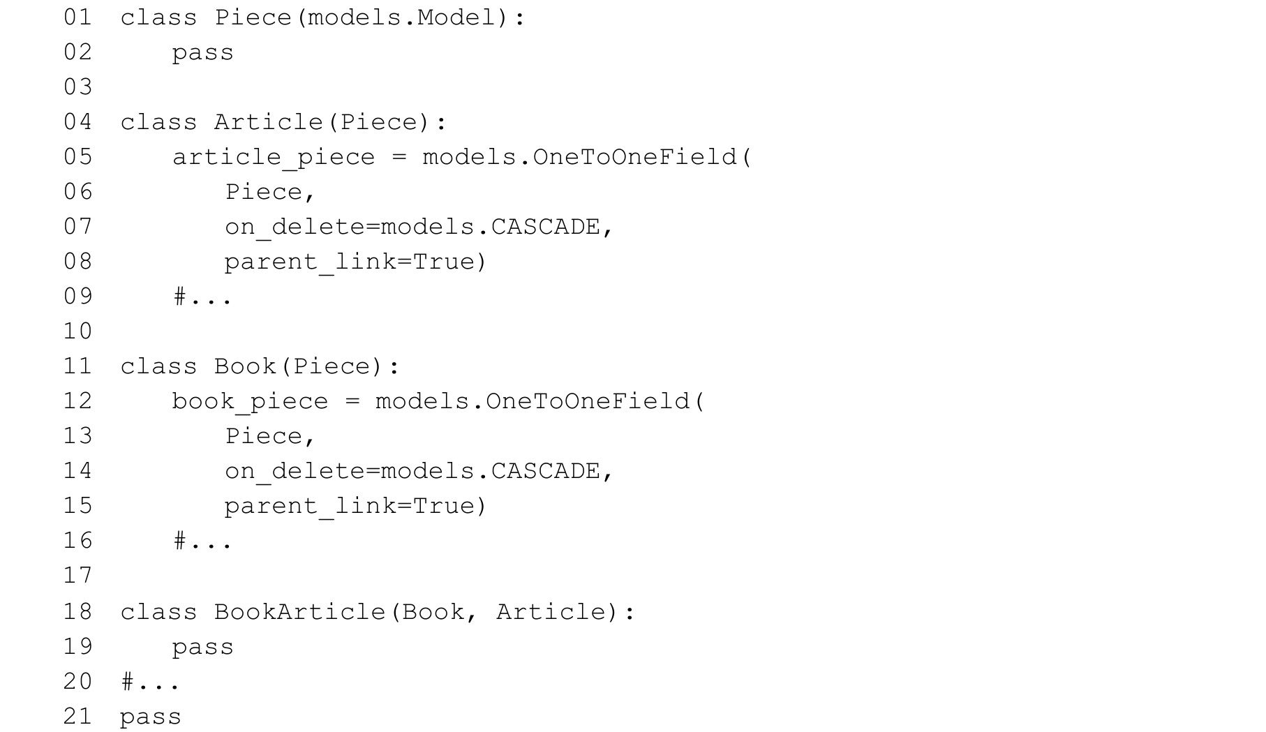 ● 第11~16行代码中,定义了第二个继承自基类(Piece)的类(Book),用于描述文章的模型。其中,在第12~15行代码中定义了一个属性(book_piece),该属性通过OneToOneField方法获取。