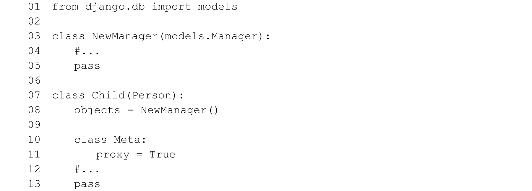● 第03~05行代码中,在不替换已存在的默认管理器情况下,为代理模型添加了新管理器(NewManager)。
