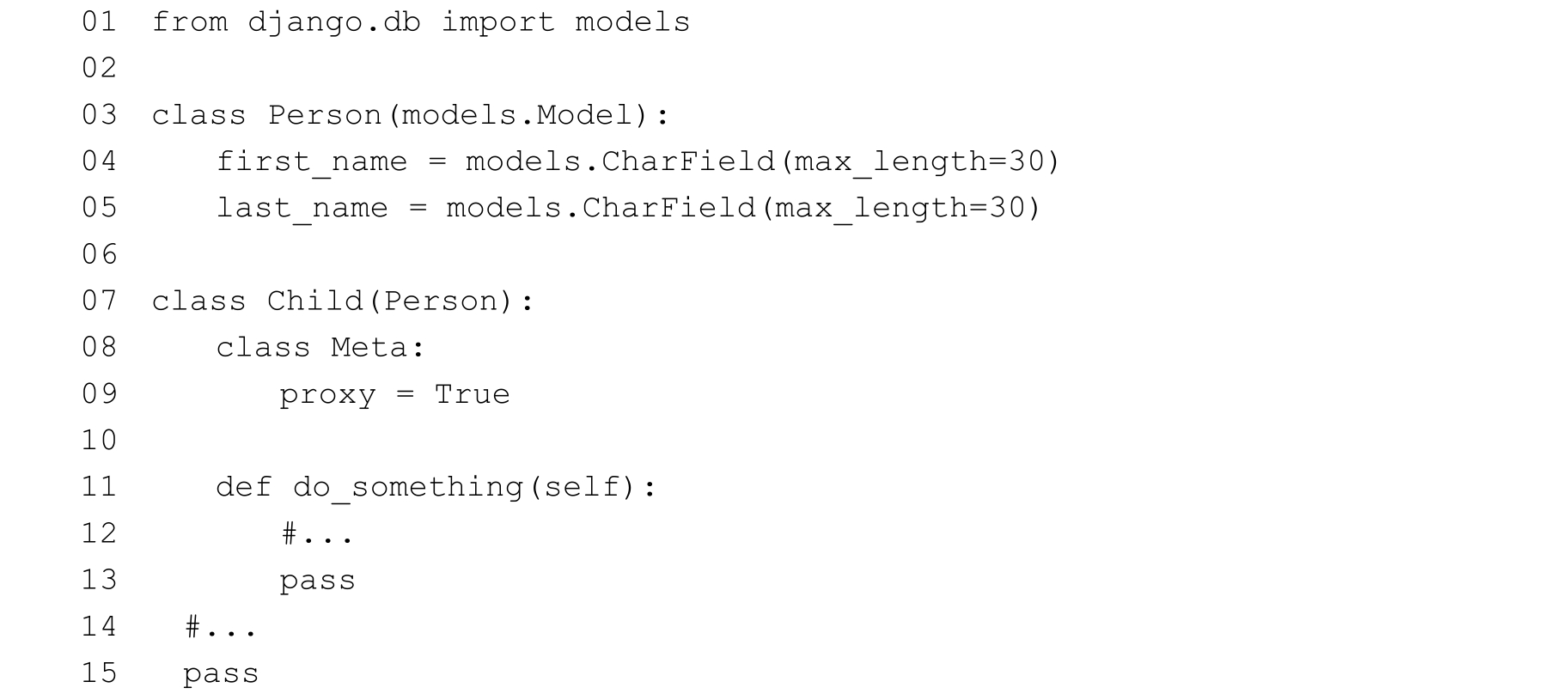 ● 如果只想修改模型的Python级行为,同时要保留原有字段,请配置Meta.proxy=True选项。这个配置将使得代理模型在保存数据时,数据结构与原模型的保持一致。