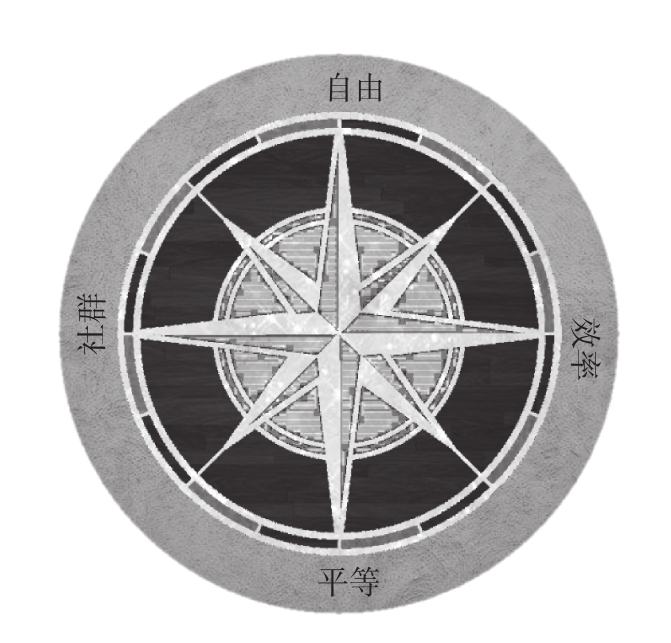 图3-1是一个“价值”指南针,我们看到一个美好社会的四极由四个方面构成:自由、平等、效率、社群。这四个方面,我们并不是要求让每一个点达到它的极致,而是要达到相互之间的一种平衡。有时候自由和平等有冲突,有时候平等和效率、效率和社群也会有冲突。那么如何平衡好这四极呢?那就要靠一个美好社会最重要的运行机制。