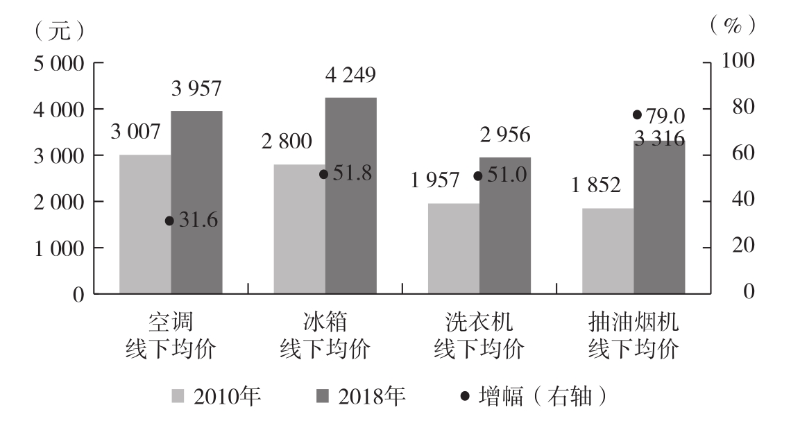 图3-2 2010年和2018年4类家电产品均价和增幅对比