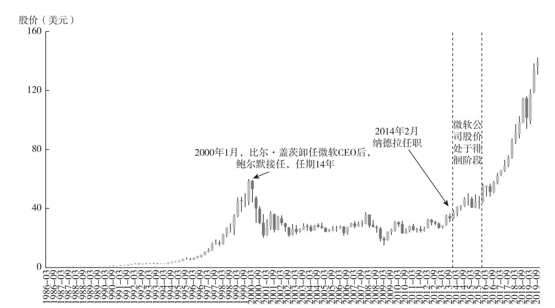 我们回到《刷新》。微软第一波股价上升,是从1986年上市到2000年到达高点。史蒂夫·鲍尔默(Steve Ballmer)接班以后,股价长期徘徊在一个箱体内(见图3-12)。纳德拉任CEO以后,2014年2月至2015年9月,微软的股价处于徘徊阶段,但当他把整个公司的价值观刷新了一遍以后,微软的变化非常大。我2019年9月到微软参观,有人告诉我以前微软是末位淘汰制,比较残酷。纳德拉上任以后取消末位淘汰制,个人的考核方式变了,他考核的是:“请举例说明,在你的成功过程中,有谁帮了你的忙?在别人的成功过程中,你帮了哪些忙?”通过这一条,整个公司文化就实现了团队化,而不是内部的钩心斗角,所以微软在2015年9月完成刷新以后,它的股价从40美元左右涨到2019年12月的156美元,整整涨了3倍。