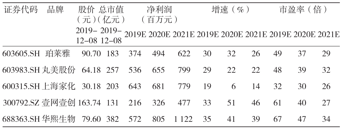 海外高端强势品牌在中国也获得了快速增长,不管是酩悦轩尼诗(LVMH)、爱马仕还是雅诗兰黛,这些公司在中国都有两位数以上的增长,我看到数据感到很惊讶(见表3-1)。我们国内的化妆品上市公司,除了上海家化以外,其他增长得都很好(见表3-2)。