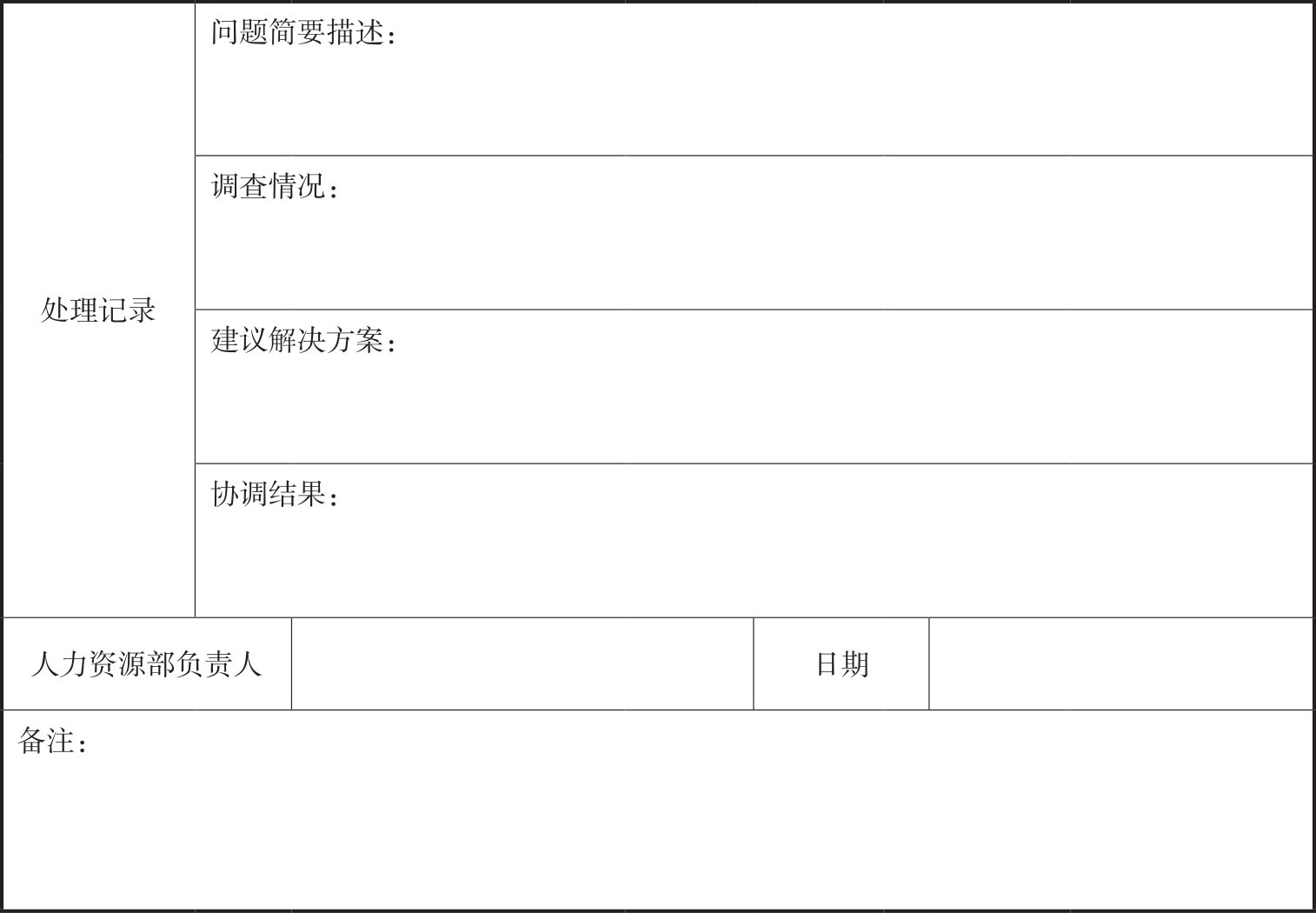(5)人力资源部决定受理申诉后,要在五个工作日内给出明确的处理意见,并填写员工申诉处理记录表,及时将处理意见转达给申诉员工。告知申诉员工的内容包括问题产生的根源(而不是谁对谁错)、申诉处理结果及后续改进的内容和方式。同时,人力资源部要填写好员工申诉处理记录表,如表2-3所示。这不仅体现投诉处理的严肃性,也能作为申诉处理的证据,便于随时查阅。