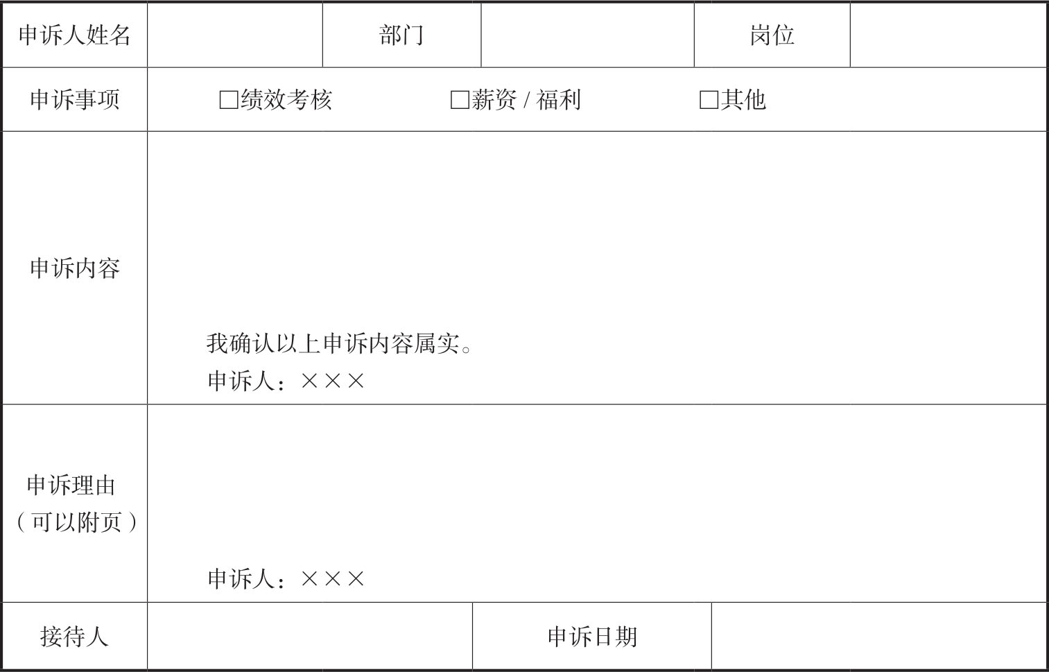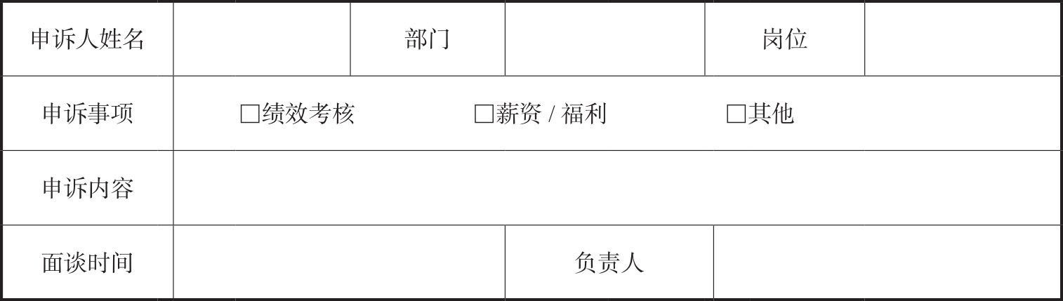 (1)员工对绩效结果不满意,填写员工绩效结果申诉表,如表2-2所示。员工绩效结果申诉表的内容包括申诉人姓名、部门、申诉事项、申诉内容(造成争议的内容)、申诉理由等。