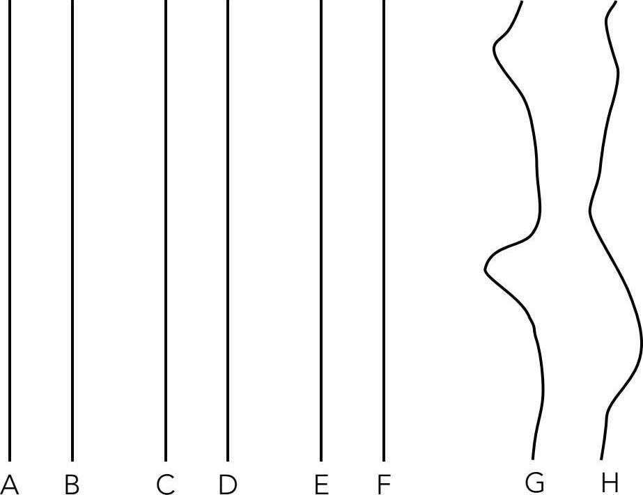这里我们要进一步研究我与物如何相关了。何以有些事物使我觉得美,有些事物使我觉得丑呢?我们最好用一个浅例来说明这个道理。比如我们看下列六条垂直线,往往把它们看成三个柱子,觉得这三个柱子所围的空间(即A与B、C与D和E与F所围的空间)离我们较近,而B与C以及D与E所围的空间则看成背景,离我们较远。还不仅此。我们把这六条垂直线摆在一块看,它们仿佛自成一个谐和的整体;至于G与H两条没有规律的线则仿佛是这整体以外的东西,如果勉强把它搭上前面的六条线一块看,就觉得它不和谐。