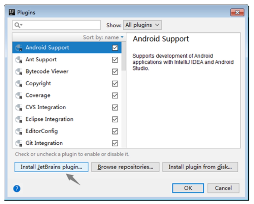 在弹出的窗口中单击下方的Install JetBrains plugin...按钮,如图1-19所示。