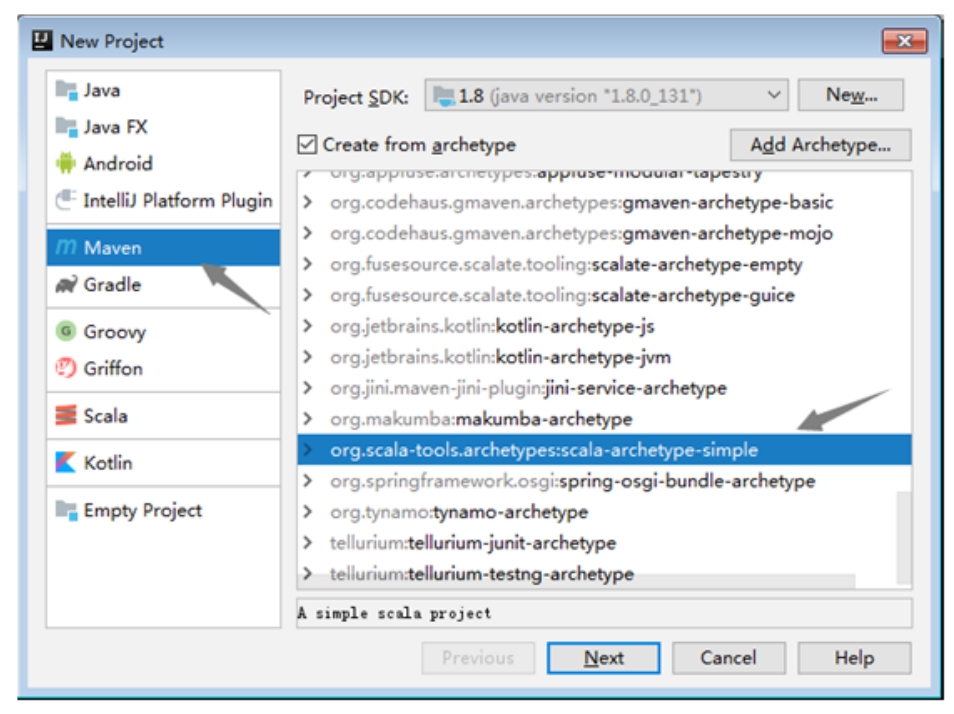 在IDEA中选择File→new→Project...,在弹出的窗口中选择左侧的Maven项,然后在右侧勾选Create from archetype并选择下方出现的scala-archetype-simple项(表示使用scala-archetype-simple模板构建Maven项目)。注意上方的Project SDK应为默认的JDK1.8,若不存在,则需要单击右侧的New...按钮关联JDK。最后单击Next按钮,如图1-24所示。
