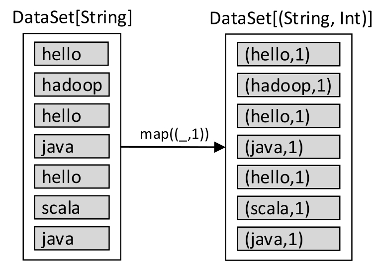 val tupleDataSet: DataSet[(String, Int)] = wordDataSet.map((_,1))